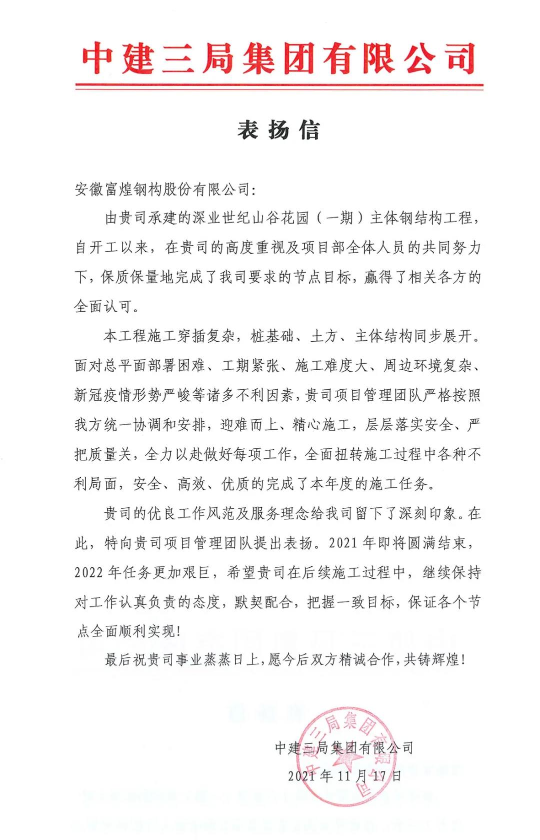 激勵(lì)前行!富煌鋼構(gòu)兩個(gè)項(xiàng)目收到業(yè)主表?yè)P(yáng)信