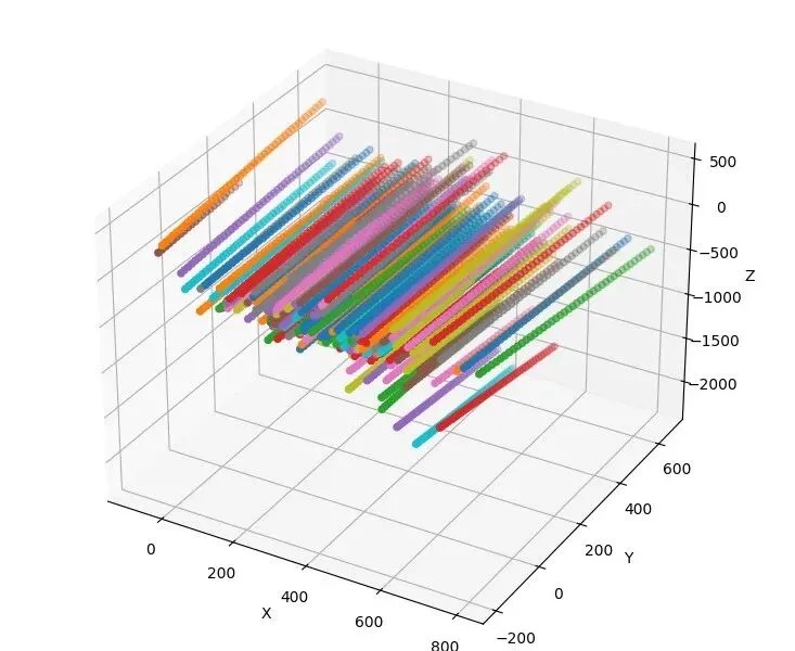 · 時(shí)空聚類:追蹤多幀圖像中的三維點(diǎn)位置構(gòu)建三維軌跡,再按空間一致性與幀時(shí)間連續(xù)性對(duì)三維點(diǎn)進(jìn)行分簇,合并距離接近、變化趨勢(shì)一致的點(diǎn)形成連續(xù)軌跡,刪除連續(xù)幀中出現(xiàn)次數(shù)小于閾值的“短軌跡”,以剔除不穩(wěn)定或偶然出現(xiàn)的噪聲點(diǎn),得到初步篩選后的有效三維軌跡集合。