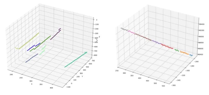 在一項(xiàng)針對(duì)數(shù)百個(gè)快速移動(dòng)黑色小球進(jìn)行拋落實(shí)驗(yàn)追蹤驗(yàn)證中,由于黑色小球表面顏色單一缺乏明顯紋理特征,屬于典型低特征場(chǎng)景,通過(guò)空間聚類MOT的幾何重建技術(shù),獲取了黑色小球準(zhǔn)確的位置信息,利用2D投影剔除一對(duì)多誤匹配方法,提高了軌跡的唯一性和準(zhǔn)確性,再進(jìn)一步通過(guò)對(duì)軌跡進(jìn)行擬合分析識(shí)別并修正錯(cuò)誤軌跡連接,增強(qiáng)跟蹤結(jié)果的穩(wěn)定性和可靠性。