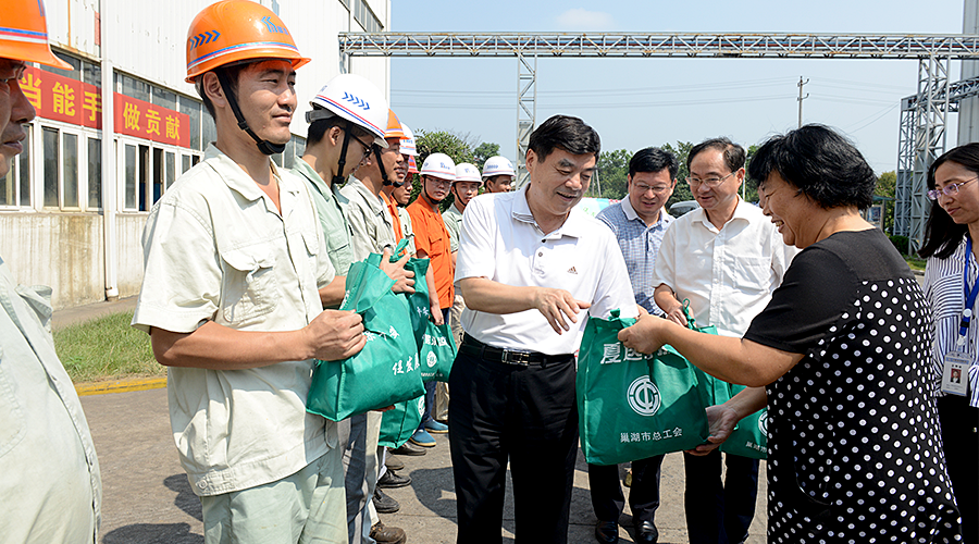 在慰問中,周恩平一行一邊將慰問品親自發(fā)放至職工手中,一邊叮囑職工在高溫季節(jié)注意防暑,做好自我調(diào)節(jié),增強(qiáng)自我保護(hù)意識,做到安全生產(chǎn),并對他們不畏酷暑、依然堅(jiān)持奮戰(zhàn)在生產(chǎn)一線的敬業(yè)奉獻(xiàn)精神表示敬意,感謝他們?yōu)槠髽I(yè)發(fā)展、為巢湖市經(jīng)濟(jì)建設(shè)所付出的心血和汗水。