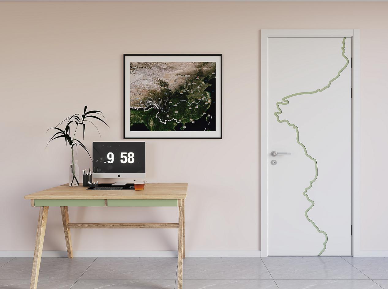 該作品設(shè)計(jì)靈感來源于長江——長江發(fā)源于青藏高原,滋養(yǎng)著中華兒女,如同一扇門守衛(wèi)著一個(gè)家庭。王德浩把長江的文化內(nèi)涵融入到木門的極簡風(fēng)格中,用基礎(chǔ)型的平板銑型門做套色設(shè)計(jì),將長江主流線形狀,放入白色霧面啞光的平板門中,蜿蜒躍動(dòng)著,墨綠色流動(dòng)的線條與白色的筆直正形成對比,采用墨綠色也契合了當(dāng)下青山綠水就是金山銀山的環(huán)保理念。