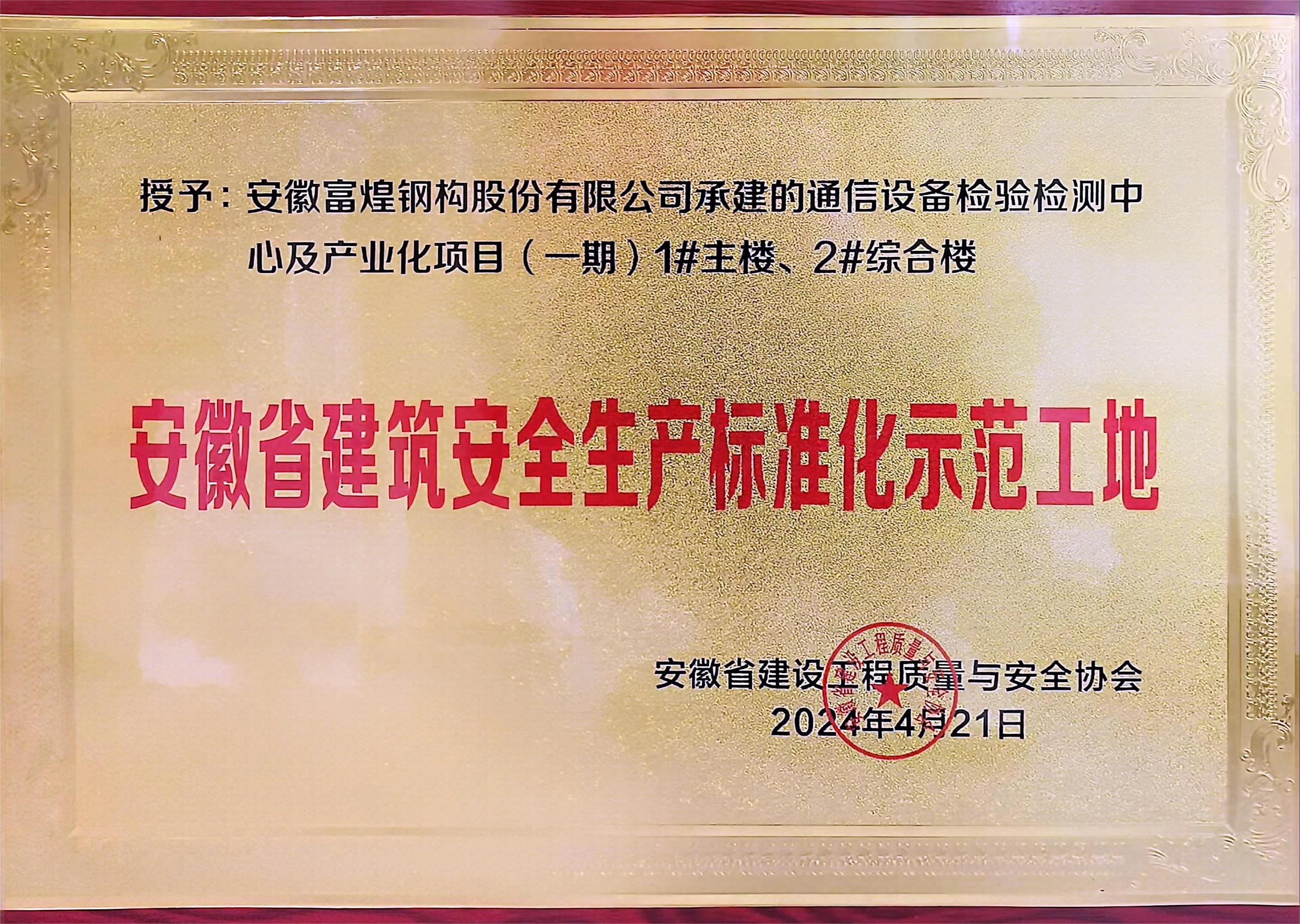 喜報|富煌鋼構(gòu)一項目榮獲“安徽省建筑安全生產(chǎn)標準化示范工地”稱號