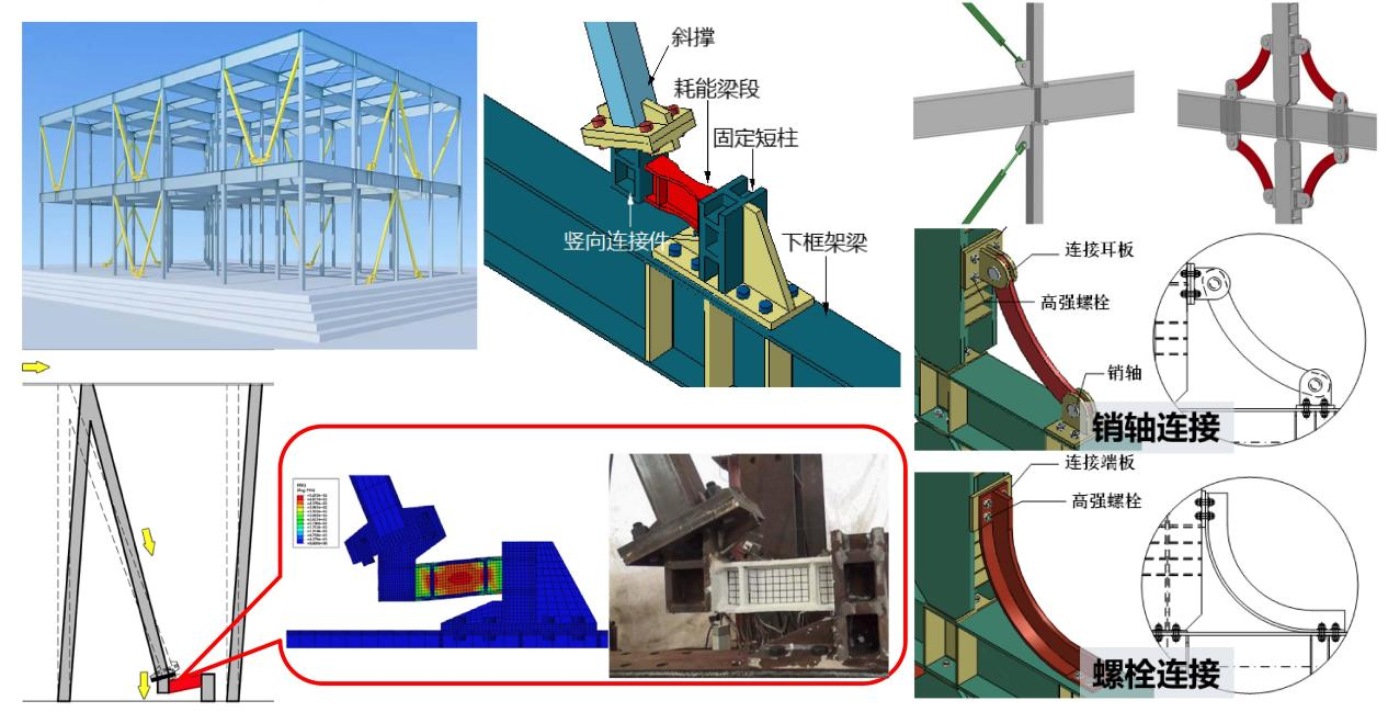項目針對傳統(tǒng)鋼結(jié)構(gòu)體系的薄弱環(huán)節(jié),成功攻克多項關(guān)鍵技術(shù)難題。在結(jié)構(gòu)體系與抗震安全方面,研發(fā)了新型柔性支撐與大斜率偏心支撐,解決了傳統(tǒng)支撐在窄空間內(nèi)容易脆斷、耗能能力不足的問題;創(chuàng)新提出“梁貫通-柱分層式”柔性節(jié)點設(shè)計方法,并結(jié)合可恢復(fù)功能耗能模塊與自復(fù)位消能搖擺技術(shù),顯著提升了建筑抗震性能,實現(xiàn)了“中震完好、大震可修、巨震不倒”的安全目標(biāo),有效克服了裝配式鋼結(jié)構(gòu)易形成薄弱層的行業(yè)痛點。