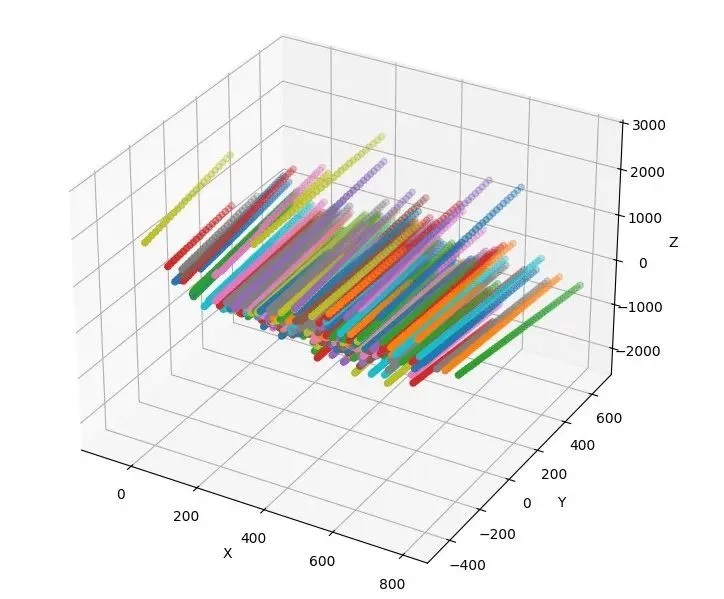 · 時(shí)空聚類:追蹤多幀圖像中的三維點(diǎn)位置構(gòu)建三維軌跡,再按空間一致性與幀時(shí)間連續(xù)性對(duì)三維點(diǎn)進(jìn)行分簇,合并距離接近、變化趨勢(shì)一致的點(diǎn)形成連續(xù)軌跡,刪除連續(xù)幀中出現(xiàn)次數(shù)小于閾值的“短軌跡”,以剔除不穩(wěn)定或偶然出現(xiàn)的噪聲點(diǎn),得到初步篩選后的有效三維軌跡集合。